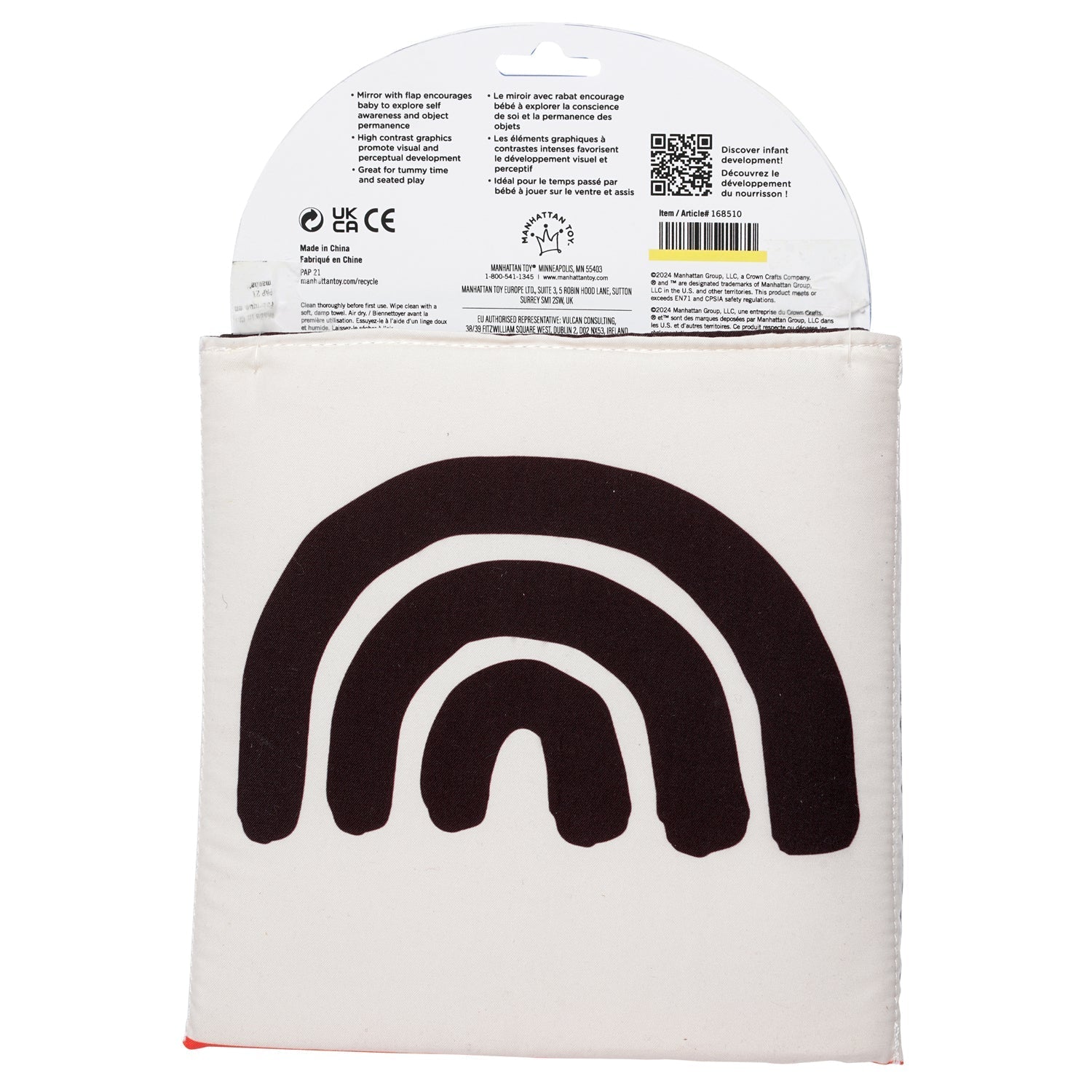 Peek-a-boo mirror play, perfectly sized for travel. A foam structure wrapped in soft fabrics and covered in high-contrast black-and-white graphics. Open the flaps to reveal a crinkle-fabric bear with a baby-safe mirror hidden underneath. Plus, the mirror is removable, for easy washing.