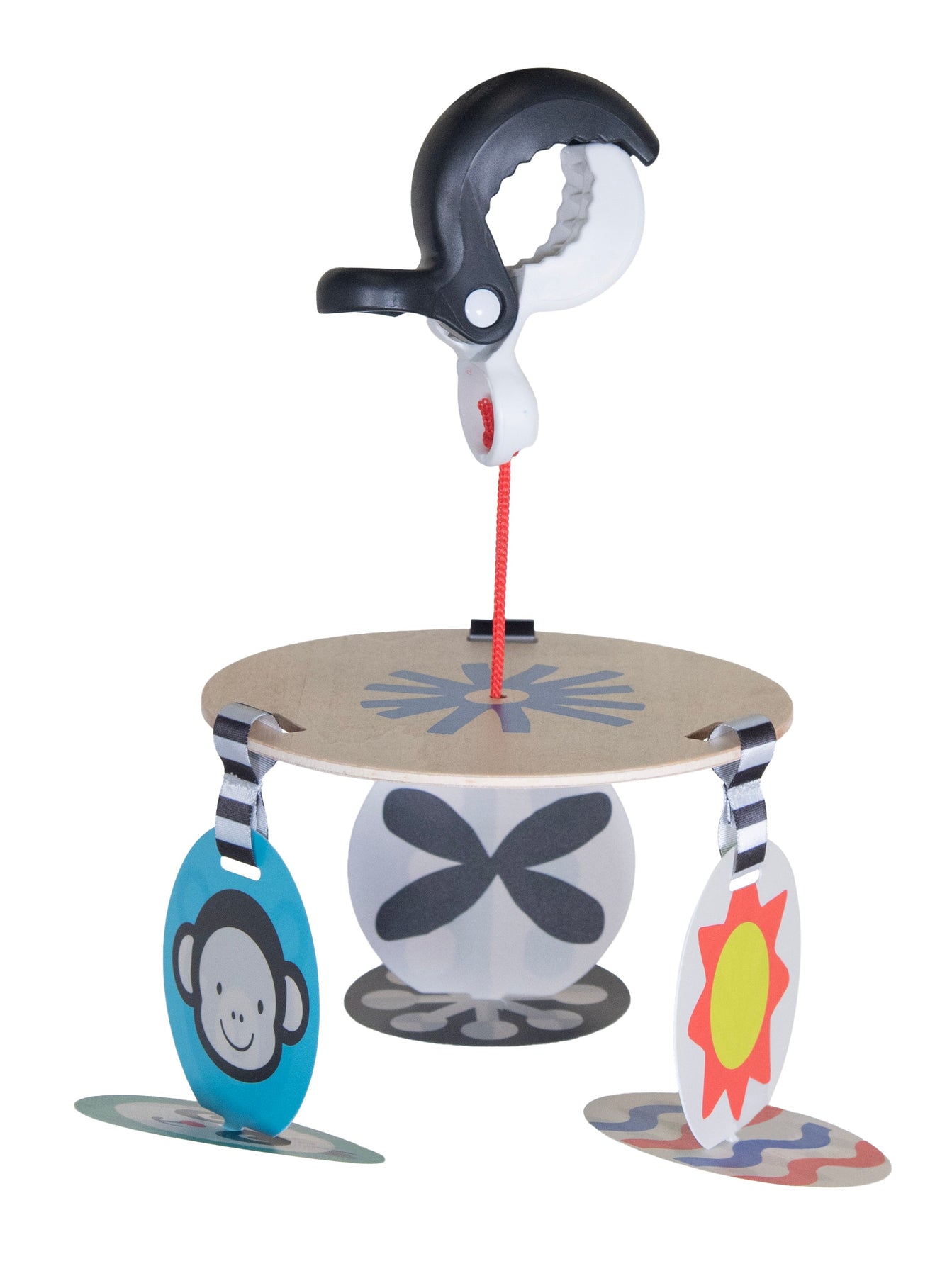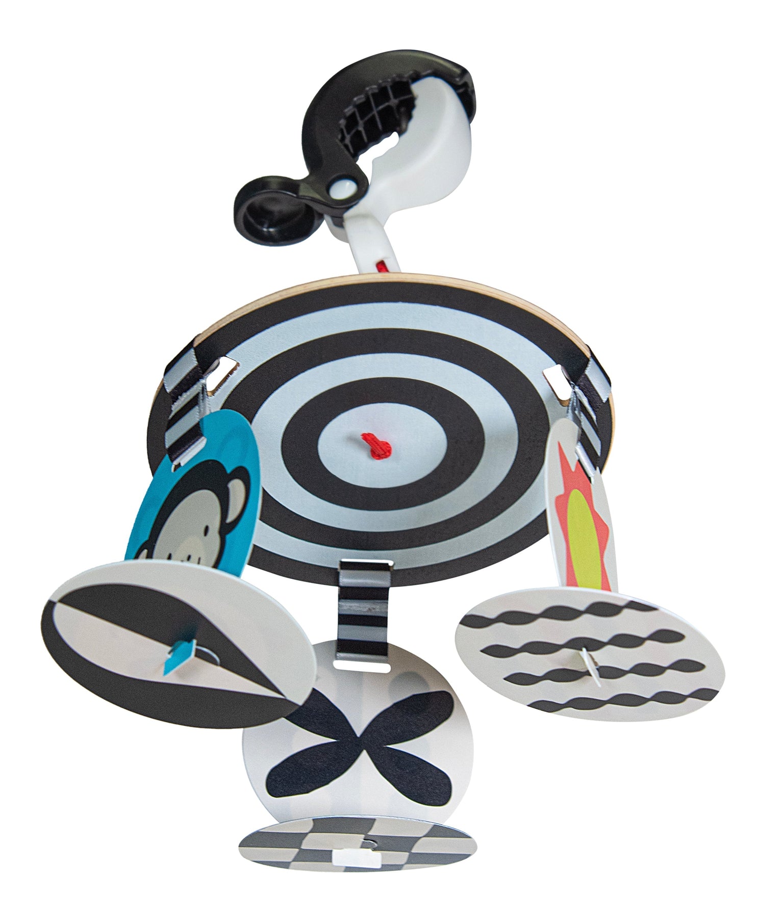 We’ve redesigned our best-selling stroller/carrier toy. It features six plastic cards (3 are reversible) that contain stimulating, research-backed, high-contrast images that will keep babies entertained wherever they go. The natural wood disk features a bullseye graphic on the underside for added visual stimulation. The toy attaches to most strollers and carriers with a black-and-white plastic clamp.